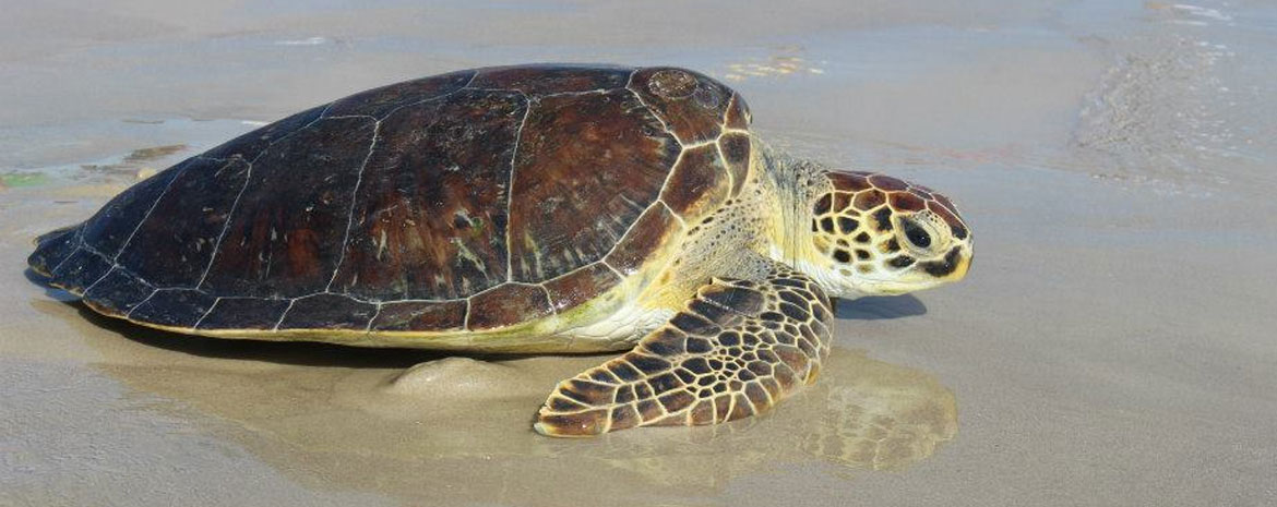 A green sea turtle is most easily recognized by its top shell. The shell covers most of the animal’s body, except for its flippers and head. Despite its name, a green sea turtle's shell is not always green. The smooth, heart-shaped shell can be a blend of different colors, including, brown, olive, gray, or black. The underside is a yellowish-white color. The green sea turtle’s head has brown and yellow markings.